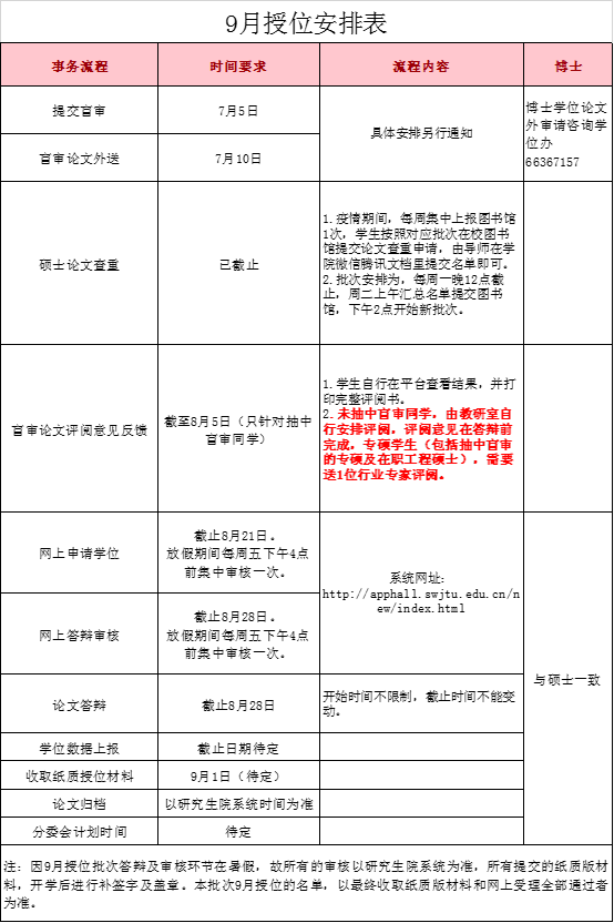 | 提交盲审 | 7月5日 | 具体安排另行通知 | 博士学位论文外审请咨询学位办 66367157 |