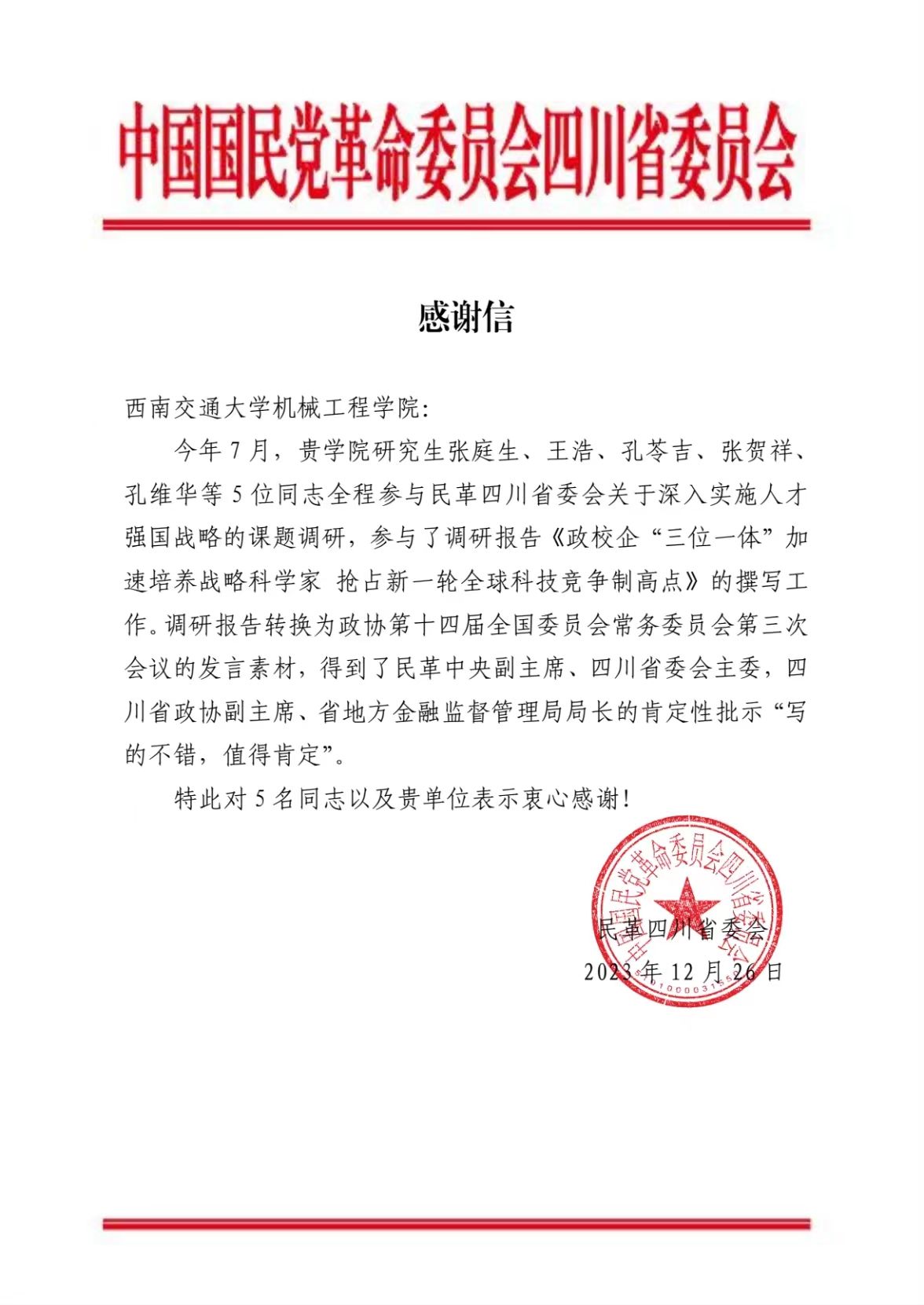 民革四川省委来信感谢机械学院研究生协助完成调研报告