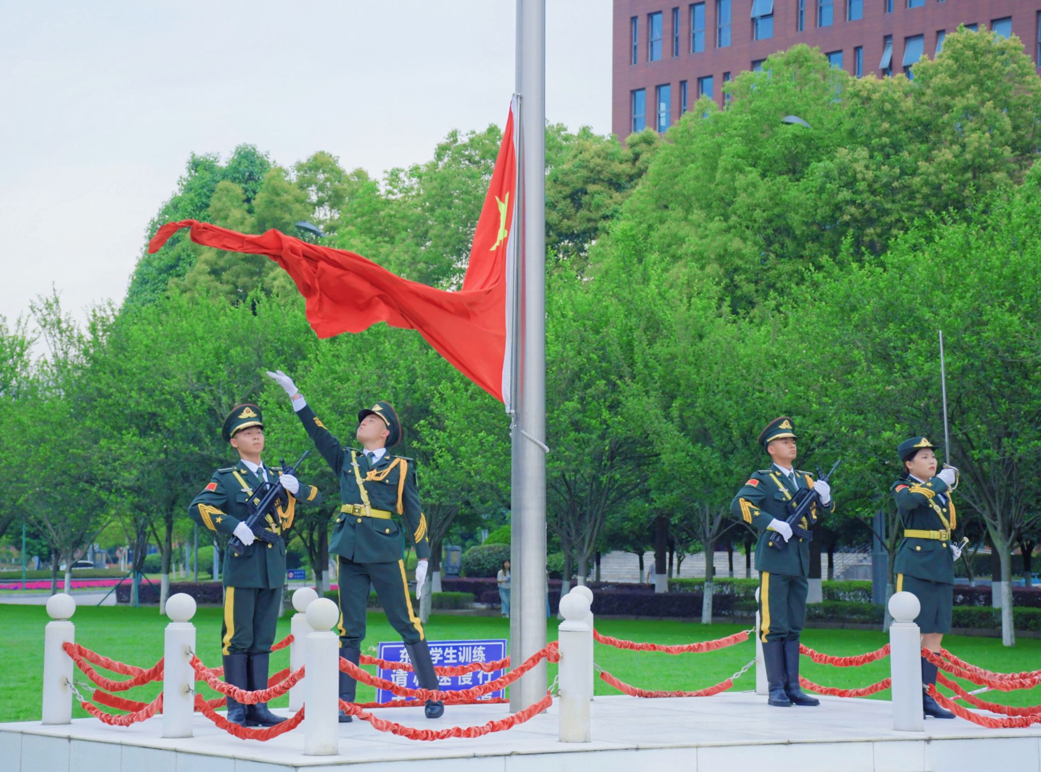上午8时半,旭日东升,晨光绚丽,升旗仪式正式开始。国旗班成员步伐铿锵、姿态昂扬,护送国旗缓缓入场。随着庄严的《义勇军进行曲》奏响,激昂的旋律回荡在校园上空。升旗手将国旗奋力抛出,五星红旗在微风中舒展身姿,冉冉升起。全体师生整齐肃立,齐声高歌,目光如炬地凝望着五星红旗向着朝阳升起,感受着激荡人心的爱国之情,汇聚成团结奋斗的磅礴力量。