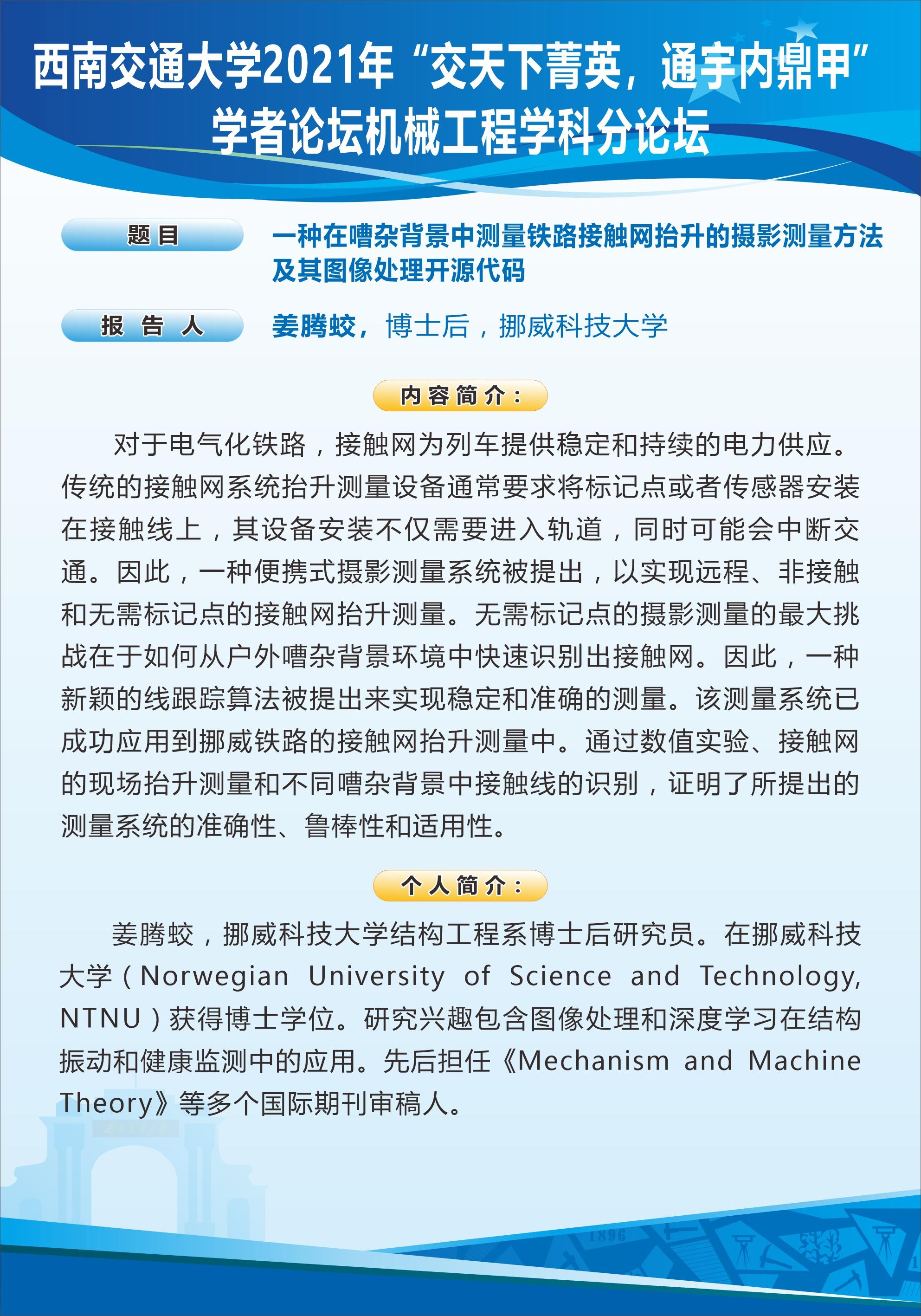 题目:一种在嘈杂背景中测量铁路接触网抬升的摄影测量方法及其图像处理开源代码 报告人:姜腾蛟,博士后,挪威科技大学  |
