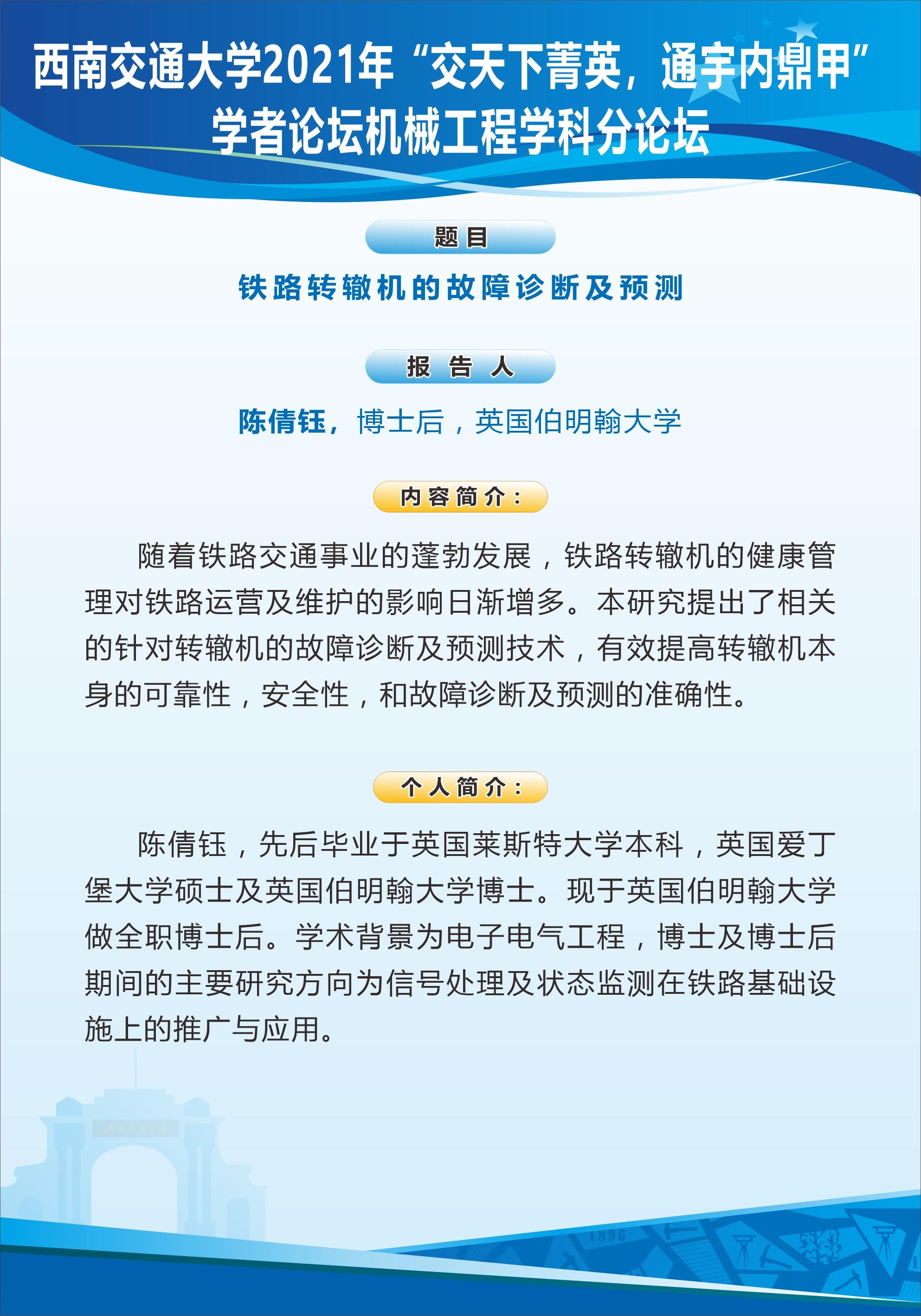 题目:铁路转辙机的故障诊断及预测 报告人:陈倩钰,博士后,英国伯明翰大学  |